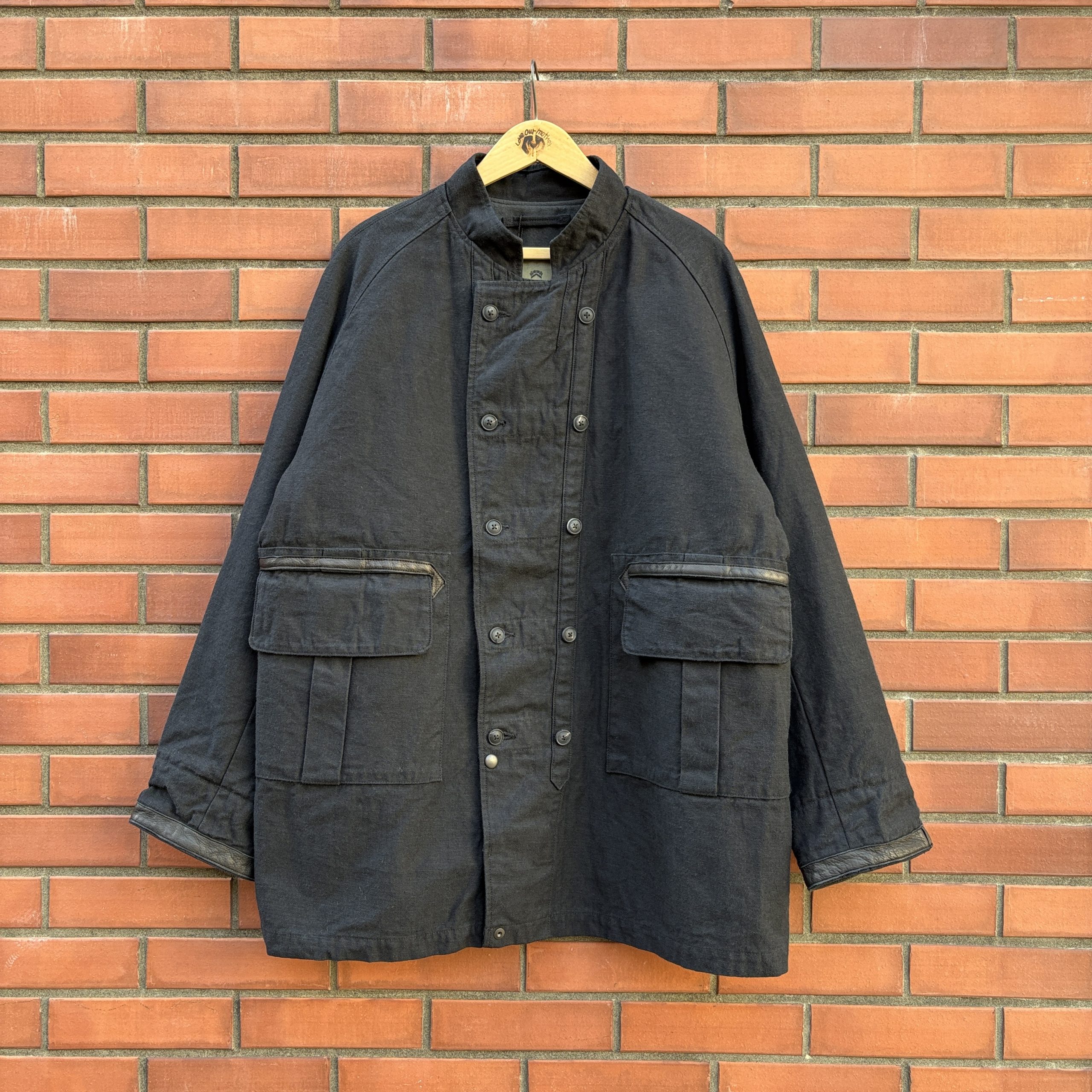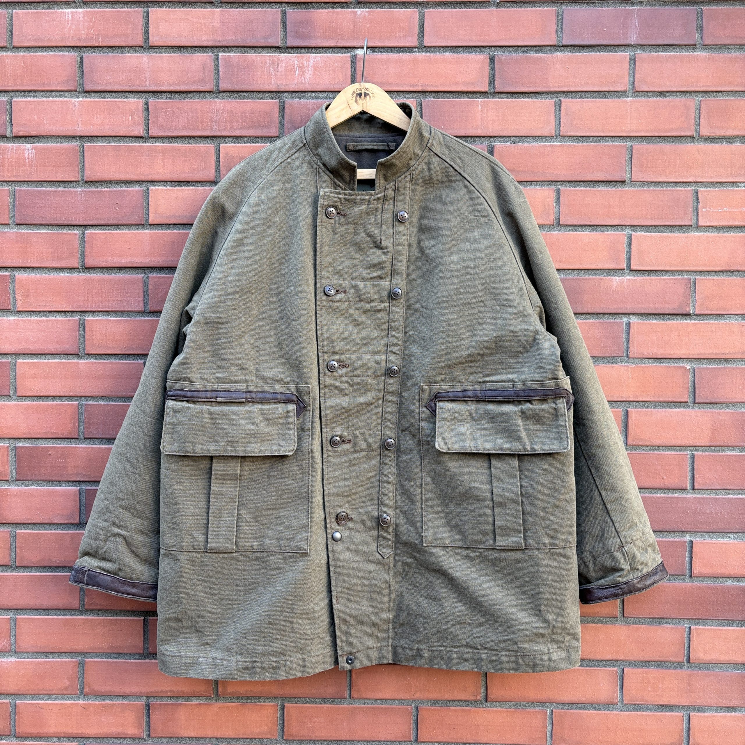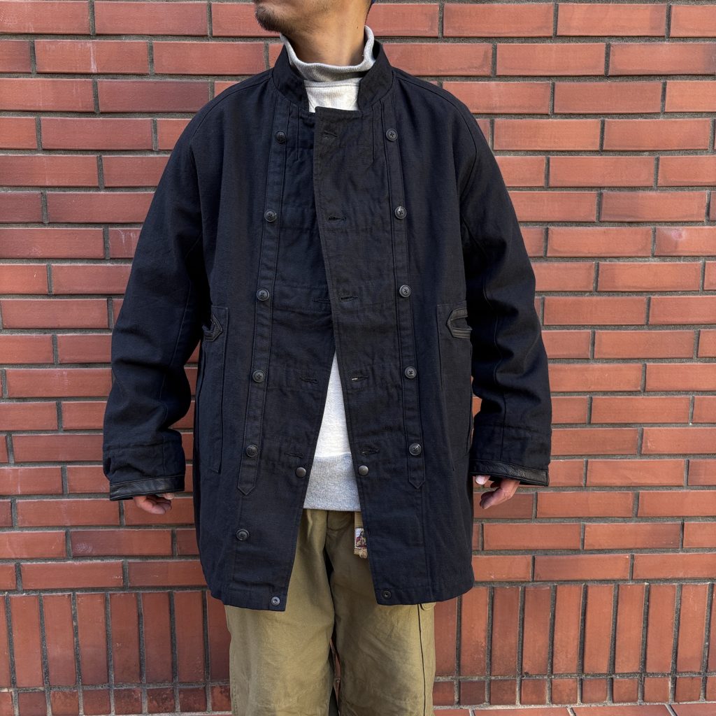 ダブルブレストのフロント、ラグランスリーブ、耐久性を考慮し随所に配されたレザー使い、防寒性を高めるために袖内側に配されたリブ。
